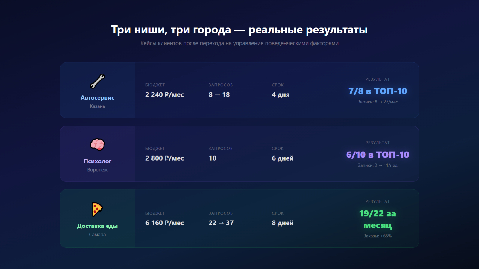 Вывод: накрутка поведенческих факторов работает в принципиально разных нишах — от B2C до личного бренда, от услуг до доставки. Общий знаменатель: правильный инструмент даёт результат за дни, а не за месяцы.