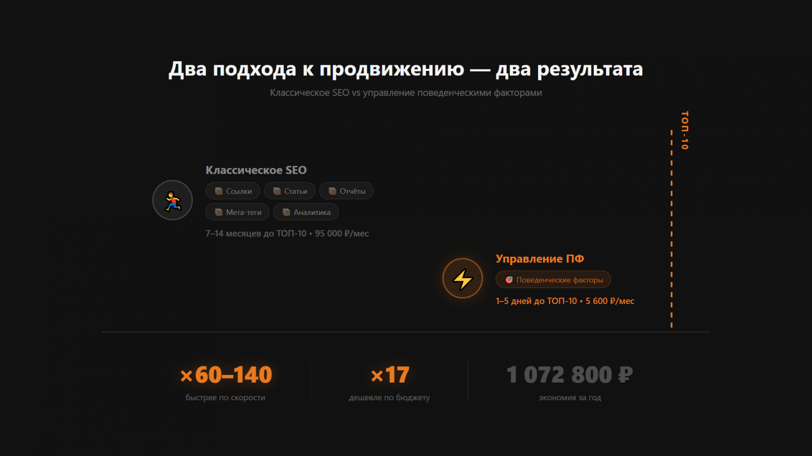 Смотрите какая штука: по статистике 2025–2026 года, средний срок вывода сайта в ТОП-10 через классическое SEO — 7–14 месяцев. Через управление поведенческими факторами — 3–7 дней. Не месяцев. Дней.