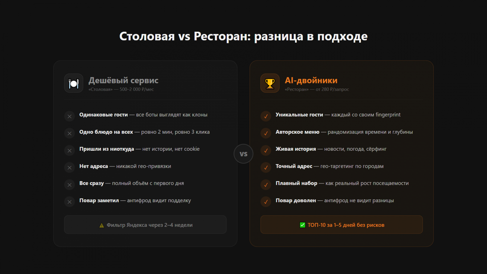 Реальность: Разница — как между профессиональным спортсменом и манекеном в спортивной форме. Дешёвый бот заходит на сайт с одинаковым IP, одинаковым браузером, одинаковым сценарием. Антифрод Яндекса видит 200+ параметров каждого визита. Когда 50 «посетителей» выглядят как клоны — это не просто подозрительно. Это приговор.