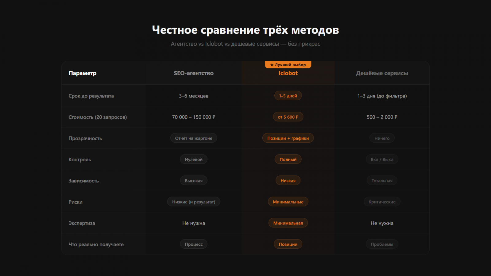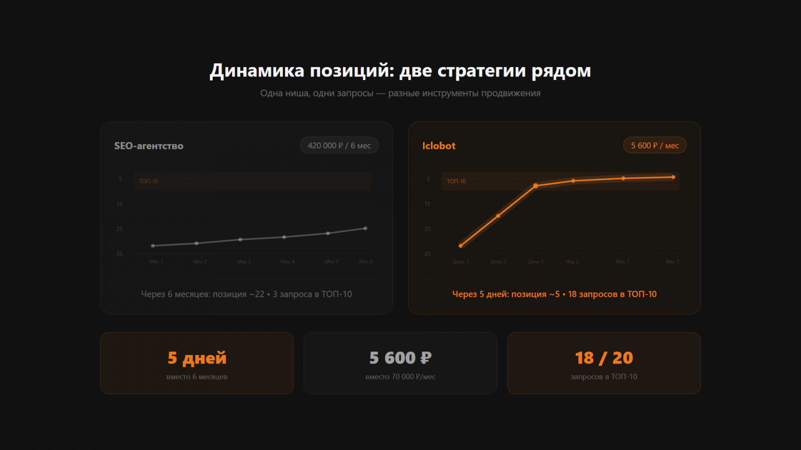 Вывод: стандартное SEO — не плохое. Оно просто медленное и дорогое для того результата, который даёт. В 2026 году есть способ быстрее.