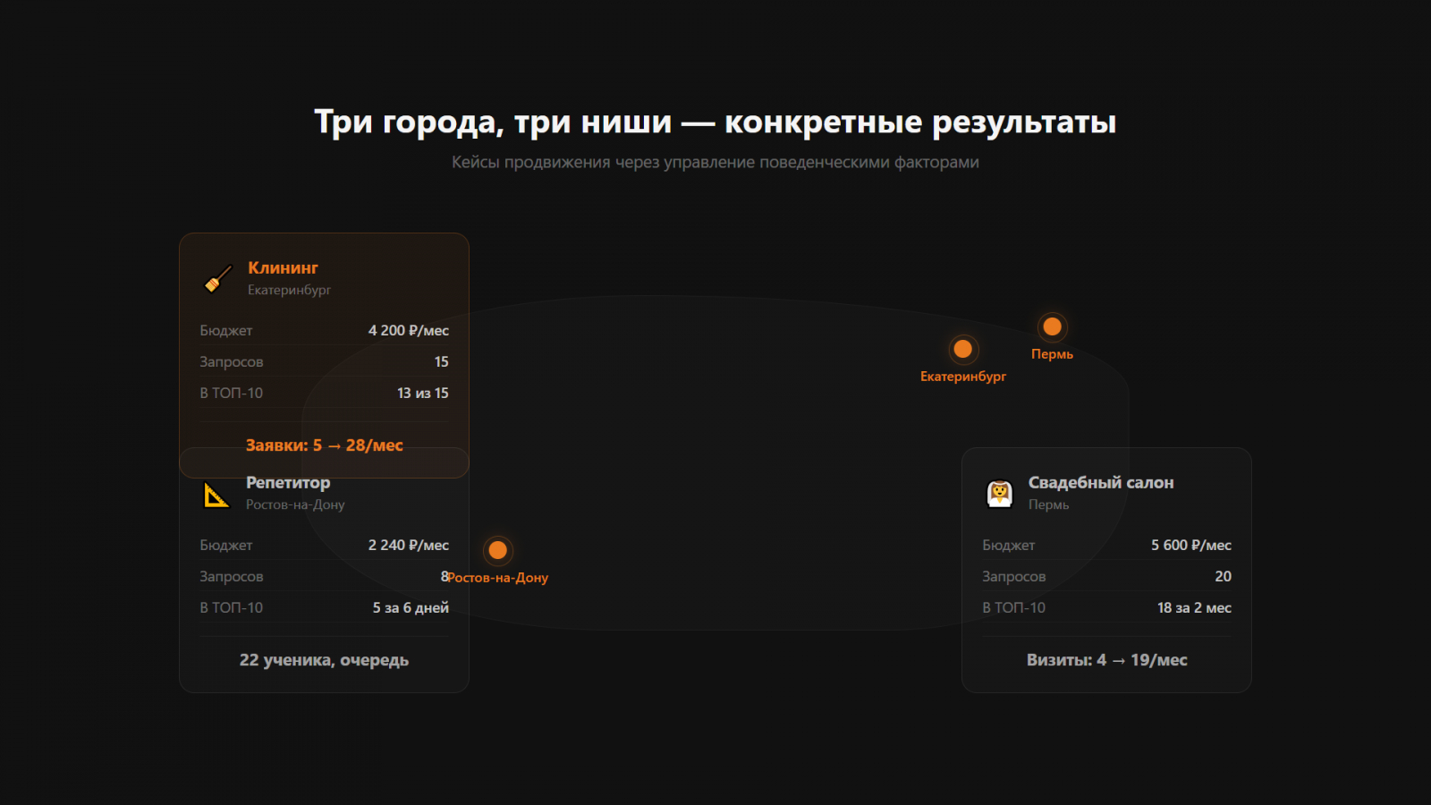 Не «обезличенные примеры». Реальные ниши, реальные города, конкретные цифры.