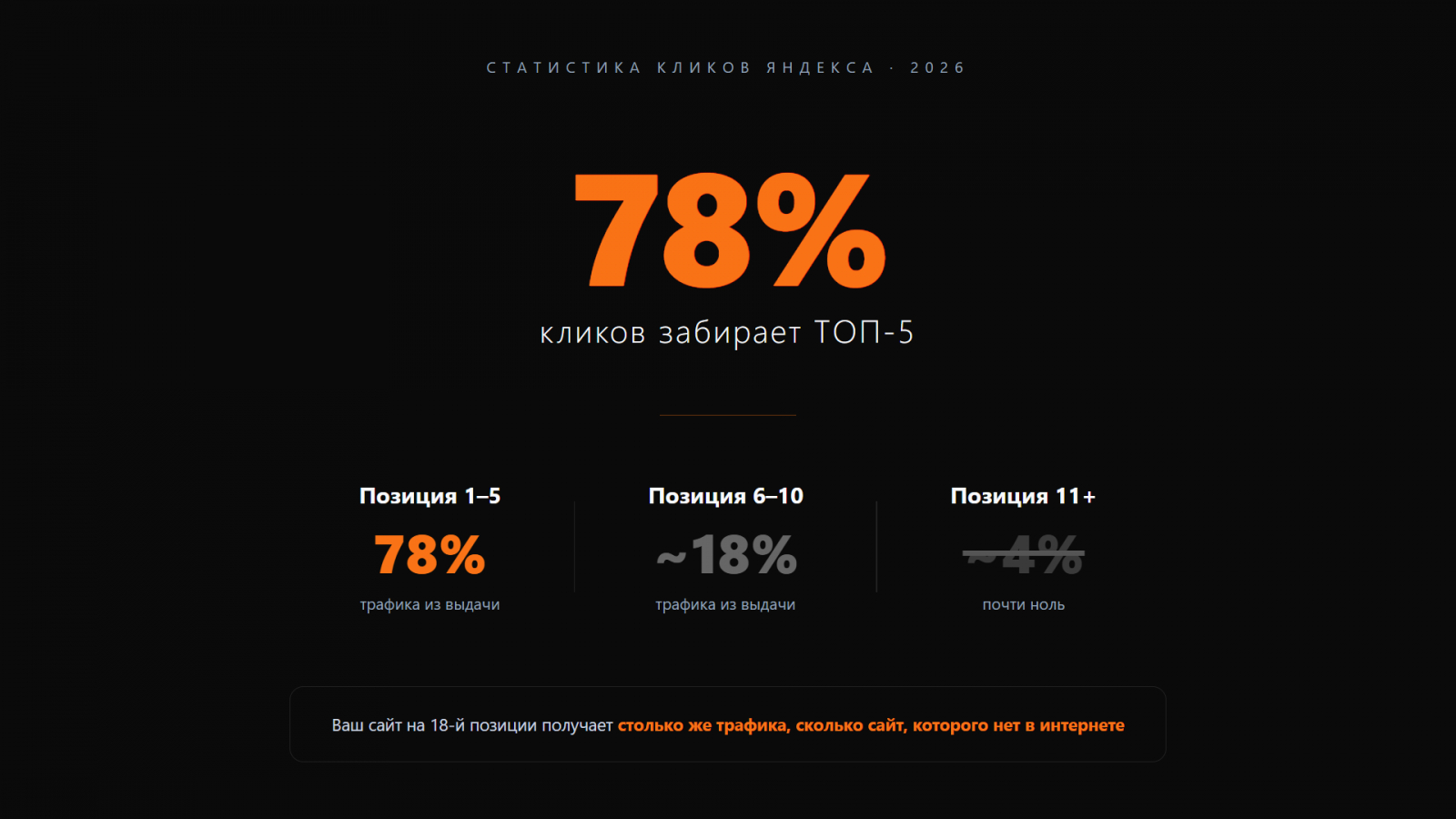 78% кликов в Яндексе забирают первые пять результатов выдачи. Не первая страница. Не ТОП-10. Именно ТОП-5.