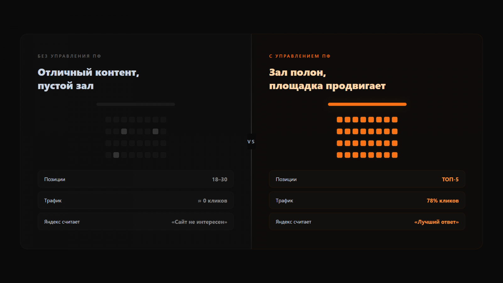 На практике: вы платите 100 000 ₽/мес, получаете тексты (которые никто не читает, потому что сайт на 30-й позиции), ссылки (которые Яндекс почти перестал учитывать) и отчёт на 20 страниц (который показывает процесс, а не результат).
