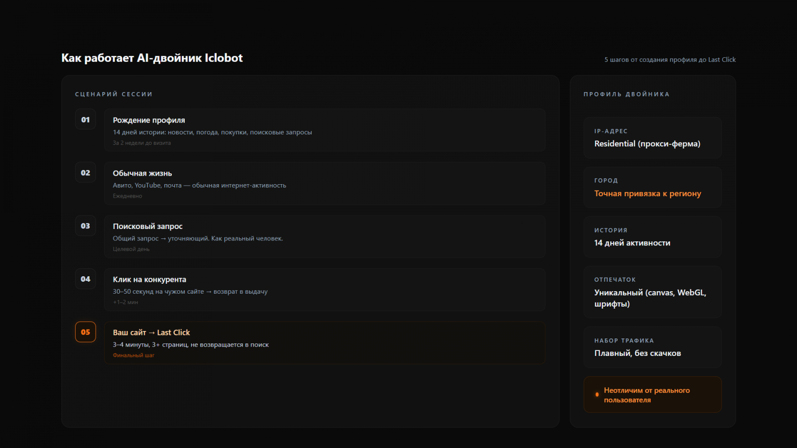 Шаг 5 — Last Click. 3–4 минуты на вашем сайте. Прайс → услуги → отзывы. Мышь двигается естественно — с паузами, ускорениями, случайными микродвижениями. Скролл — переменный. И потом… не возвращается в поиск. Всё.