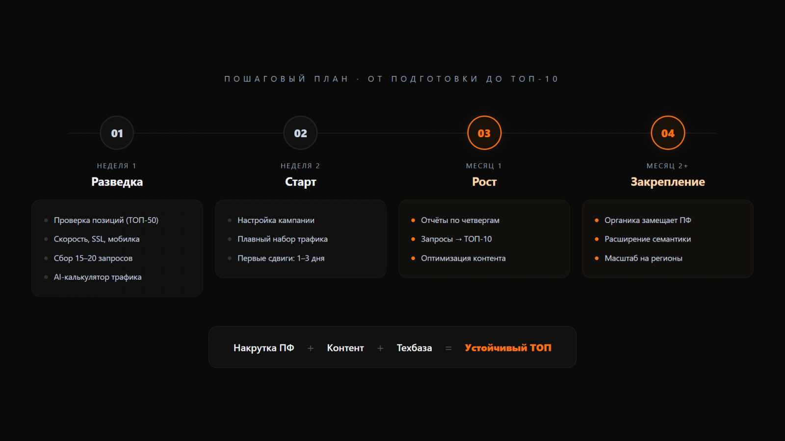 Сначала базовая техническая работа: скорость, мобильная версия, SSL, корректная индексация. Минимальный контент на посадочных страницах. Обычно 2–4 недели — и сайт попадает в ТОП-50. После этого подключаете накрутку пф трафика и начинается рост.