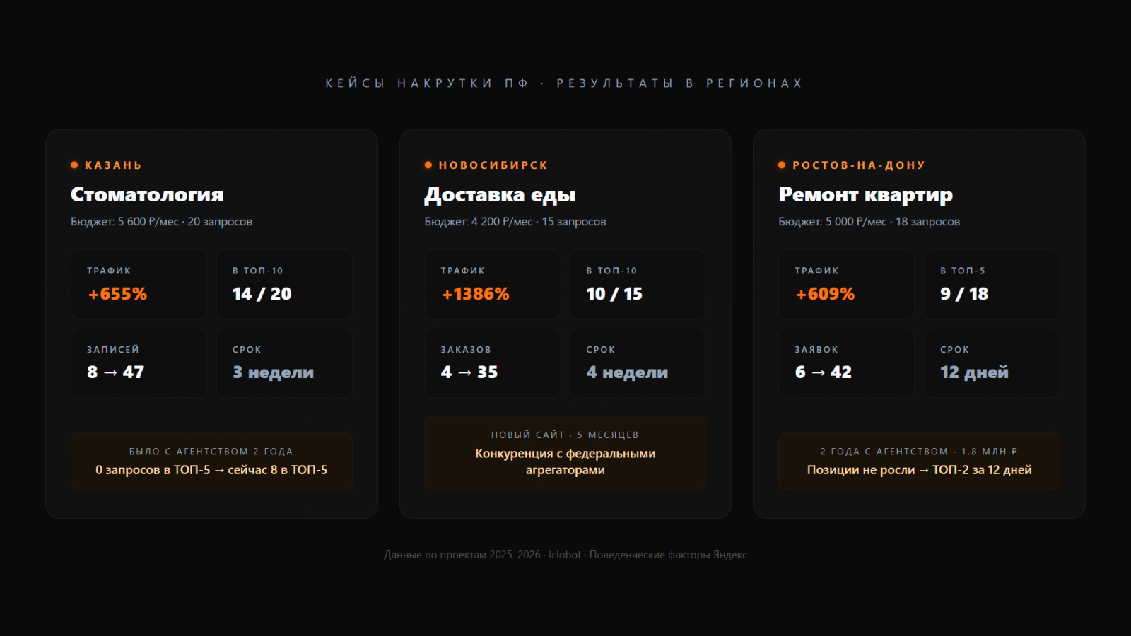 Вот что важно понимать: во всех трёх кейсах бюджет на ПФ — меньше 6 000 ₽/мес. Меньше, чем средний ужин на двоих. А результат — кратный рост заявок, который реально меняет бизнес.