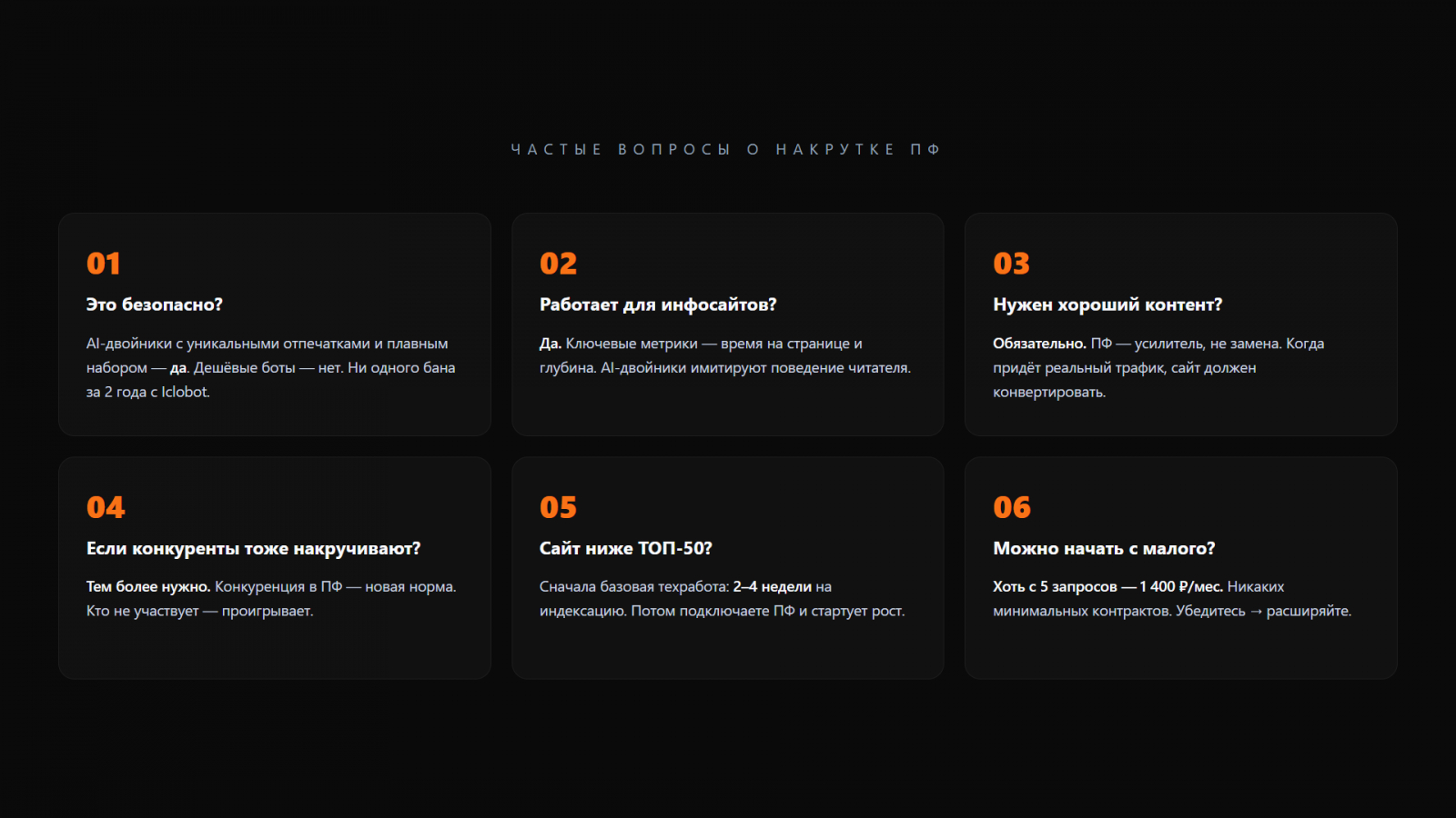 Обязательно. Накрутка пф продвижение сайта — не замена контенту, а усилитель. Это как в ресторане: первых гостей вы привели через управление ПФ, но если кухня плохая — они уйдут и расскажут друзьям. Когда реальные пользователи начнут приходить из ТОП-5, их поведение должно подтвердить то, что «нарисовали» AI-двойники.