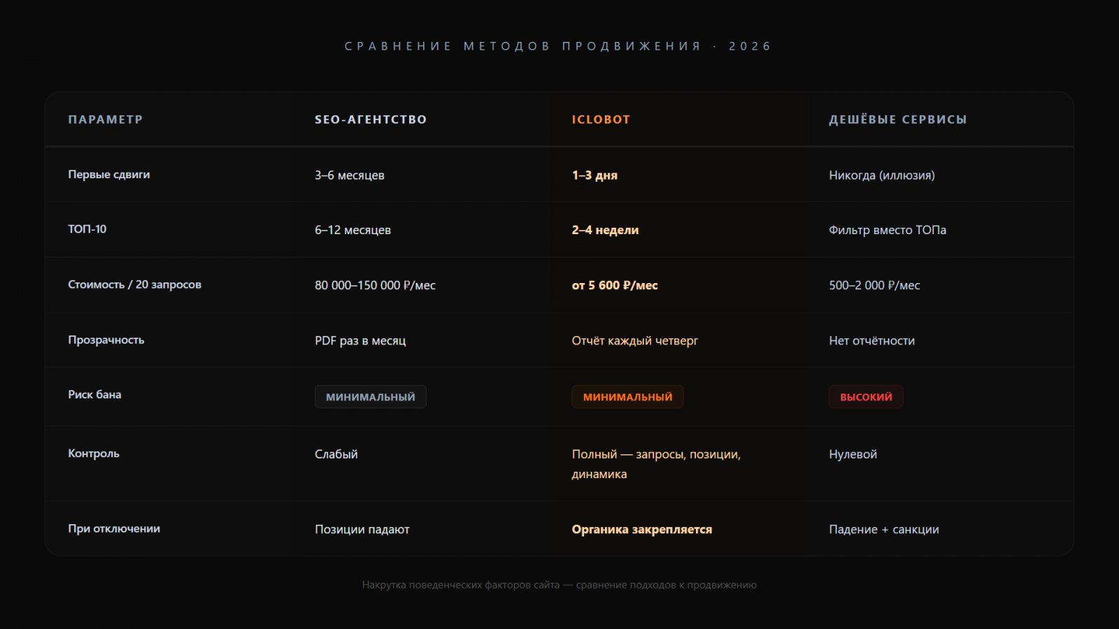 Обратите внимание на строку «Что при отключении». С агентством вы в зависимости: перестали платить — позиции поехали вниз, потому что ссылки отвалились, контент не обновляется. С качественным сервисом накрутки поведенческих факторов всё иначе: пока вы в ТОП-5, реальные пользователи генерируют те же самые сигналы, которые раньше создавали AI-двойники. Позиции закрепляются органически.