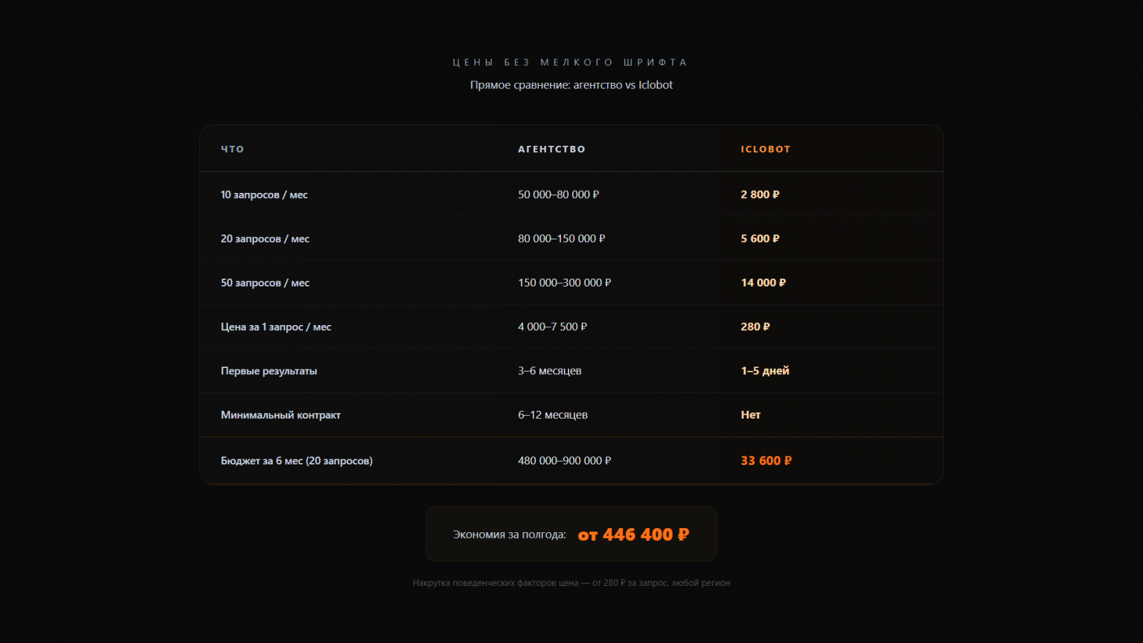 Тут есть нюанс: дело не только в экономии. Дело в скорости возврата денег. Агентство начинает окупаться (может быть) через 8–12 месяцев. Накрутка пф рост позиций через Iclobot — через 2–4 недели. Это разные вселенные.