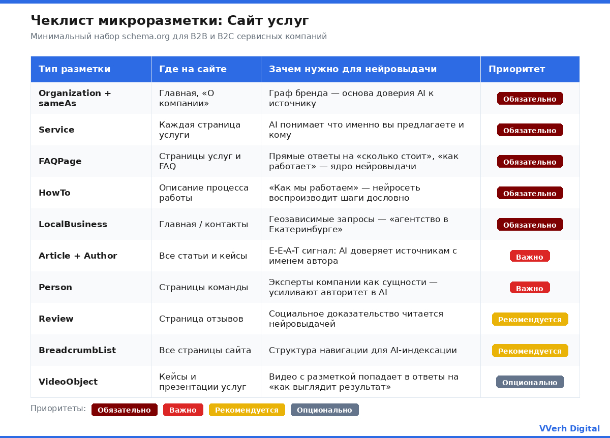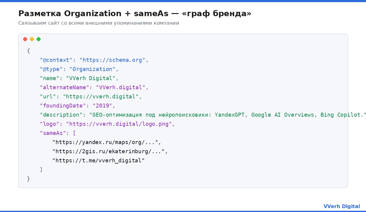 Первый шаг - связать сайт со всеми внешними упоминаниями компании. Нейросеть должна понимать, что vverh.digital, карточка в Яндекс.Картах, профиль на hh.ru и канал в Telegram - это одна сущность, а не разные источники.