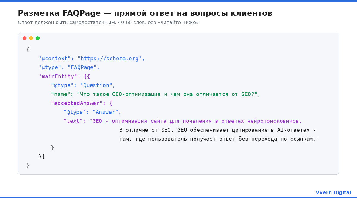По данным исследования frase.io за ноябрь 2025 года, именно FAQPage даёт наибольший прирост частоты цитирования в Google AI Overviews среди всех типов разметки - в 3,2 раза по сравнению с неразмеченными страницами с аналогичным контентом. Для YandexGPT эффект сопоставим: Алиса активно использует структурированные Q&A при формировании ответов на информационные запросы.