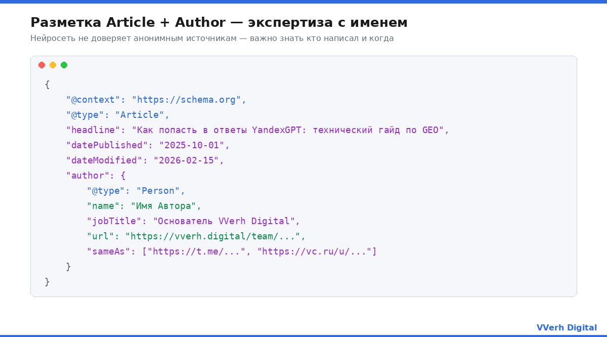 Анонимный контент для нейровыдачи - это контент без гарантий. Алиса, Perplexity и Google AI предпочитают источники, у которых есть верифицируемый автор с внешними профилями. Поле sameAs у автора работает так же, как у организации: ссылки на Telegram, vc.ru, LinkedIn подтверждают что этот человек реален и имеет профессиональную историю.