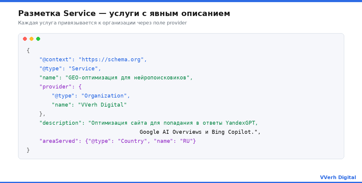 Поле provider с указанием Organization создаёт прямую связь "услуга - исполнитель". Именно это позволяет AI отвечать на запросы "кто занимается GEO-оптимизацией в России" и называть конкретные компании. Поле areaServed уточняет географию - критично для локальных запросов и B2B с региональной привязкой.