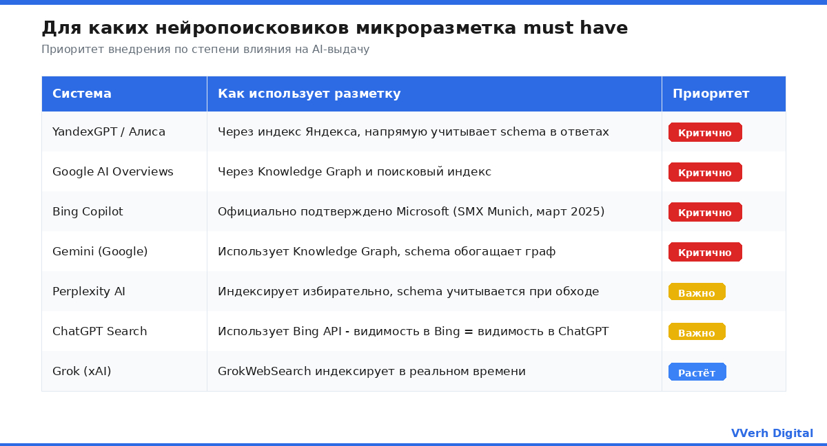 Обратите внимание: четыре системы из семи помечены как "Критично" - это YandexGPT, Google AI Overviews, Bing Copilot и Gemini. Именно они работают через поисковый индекс, где schema-данные обрабатываются напрямую. Perplexity и ChatGPT Search тоже учитывают разметку, но опосредованно - через Bing API и собственный краулер. Начинать нужно с критичных систем: они дают 80% эффекта при правильном внедрении.