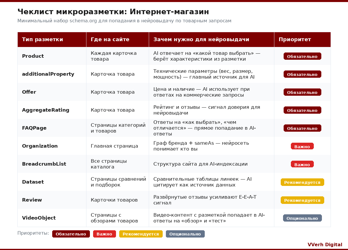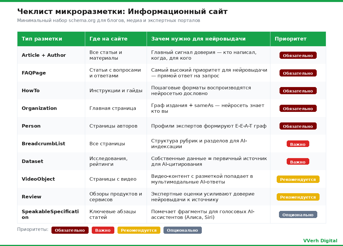 Универсального чеклиста не существует: интернет-магазину нужна разметка Product и Offer, информационному сайту - Dataset и Person, сервисной компании - HowTo и LocalBusiness. Мы разработали три отдельных чеклиста с приоритетами внедрения - берите тот, который соответствует вашему типу сайта, и внедряйте последовательно от "Обязательно" к "Опционально".