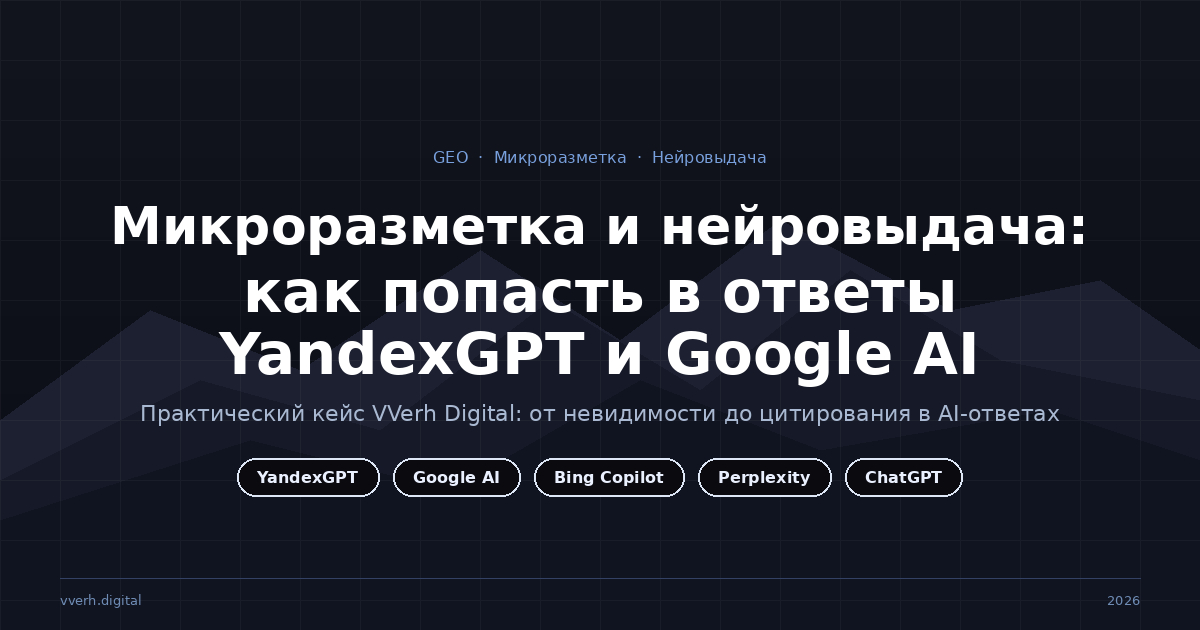 Мы столкнулись с этим на собственном опыте. Сайт VVerh Digital был в порядке технически, контент - профессиональный. Но по запросам "GEO-оптимизация", "продвижение в нейропоисковиках" или "оптимизация под YandexGPT" нас не существовало - ни в Алисе, ни в Google AI Overviews. Продвигали клиентов в AI-поиске, а сами в нём не присутствовали.
