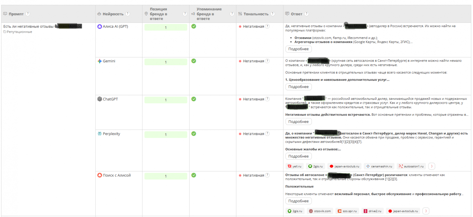 По каждому запросу фиксируйте: есть ли бренд в ответе, какой общий тон (позитивный / нейтральный / "смешанные отзывы"), какие конкретные формулировки использует AI, на какие источники ссылается.