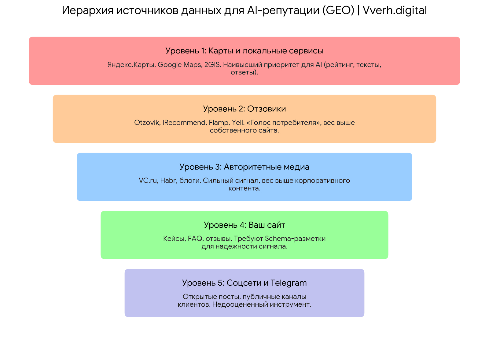 Ключевой вывод: работа с AI-репутацией - это не "прокачать карты". Это построение экосистемы сигналов, где каждый уровень усиливает общую картину.
