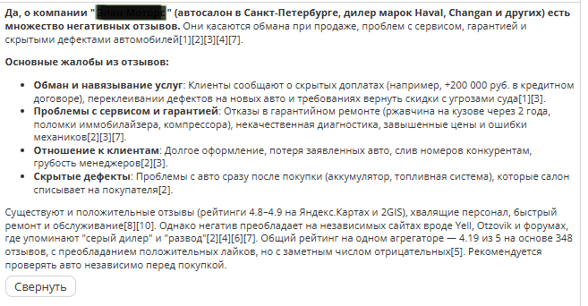 Когда потенциальный клиент спрашивает ChatGPT или Perplexity "стоит ли работать с ООО Авантюрист", он получает не список ссылок, а готовый вывод. AI уже всё за него решил: "у компании смешанные отзывы", "пользователи жалуются на сроки", "репутация неоднозначная". И это при том, что у вас рейтинг 4.2, все клиенты довольны, а отзывы в целом позитивные.