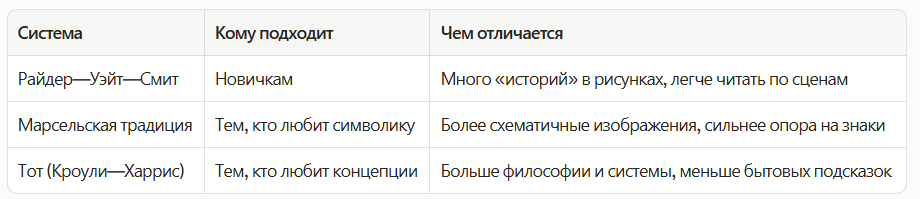 Важно понимать простую вещь: в разных традициях одна и та же карта может выглядеть по-разному, но смысловой «скелет» обычно сохраняется. Поэтому выбирайте карты не по моде, а по тому, насколько понятно вам «говорит» изображение.