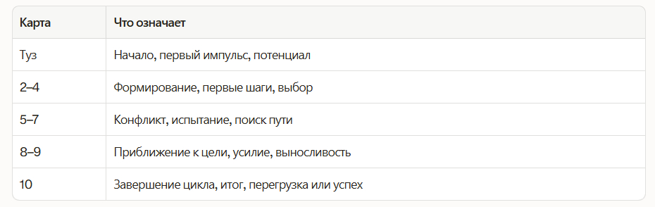 Числовая карта указывает на конкретные обстоятельства, события и динамику ситуации. Туз в любой масти — начало, импульс, семя. Десятка — завершение цикла. Числа от двух до девяти раскрывают промежуточные стадии: конфликт, сотрудничество, достижение, потеря, восстановление.