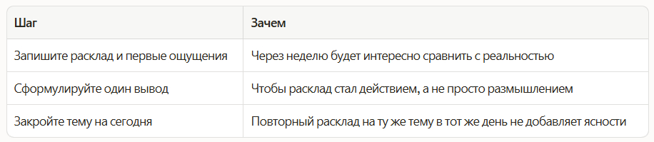 Чтобы не потерять пользу, после чтения выделите один практический шаг на ближайшие 24–72 часа и кратко записать его в заметки: так расклад Таро превращается в действие, а не в бесконечные размышления.