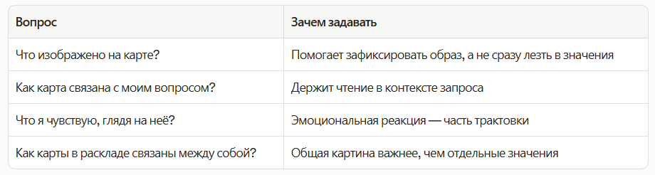 Первое — просто смотреть. Кто изображен: человек, существо, символ? Какое настроение передаёт карта — движение, покой, напряжение, облегчение? Эта первая реакция — ценный материал. Интерпретация, которая идёт от живого восприятия образа, точнее механического воспроизведения заученного значения.