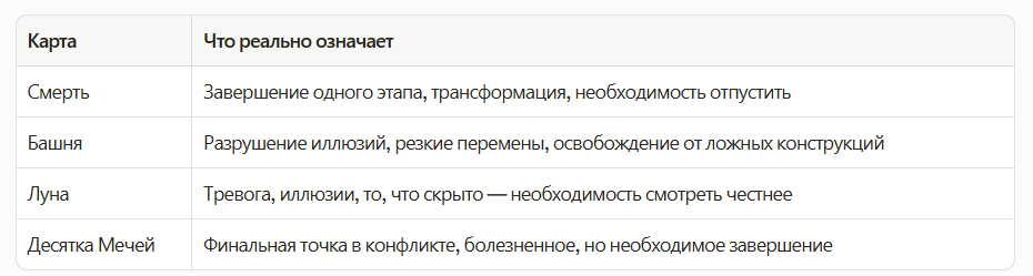 Страшная карта — сигнал, а не катастрофа. Она говорит: «Здесь есть напряжение, посмотри внимательно». Полезная информация.