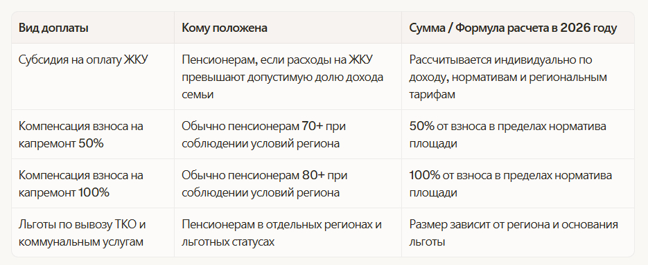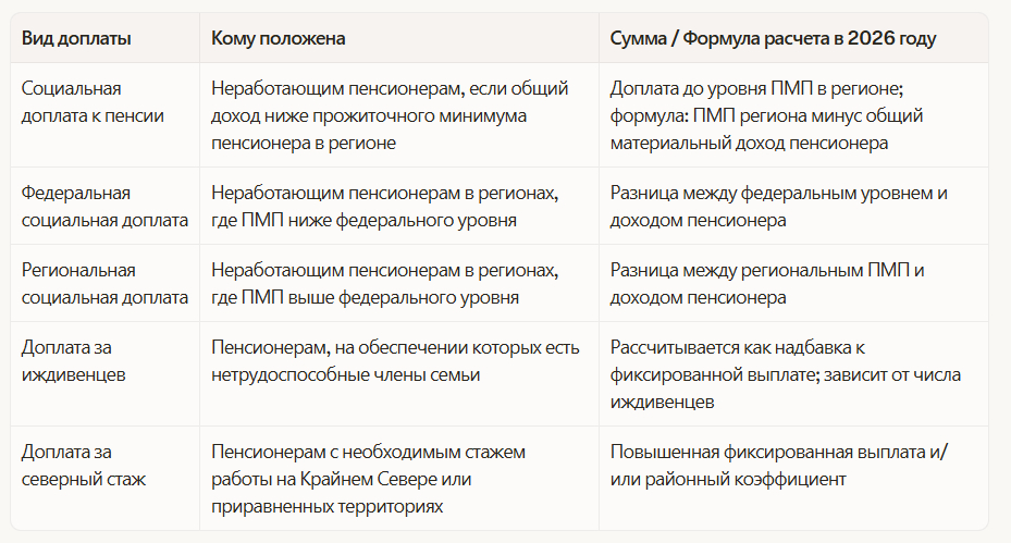 В текущем году для пенсионера положены федеральные и региональные выплаты: ежемесячная денежная выплата (ЕДВ), доплаты до прожиточного минимума, надбавки за возраст (от 80 лет), доплаты за сельский стаж и иждивенцев. Дополнительно работают налоговые льготы и субсидии на ЖКХ, льготный проезд и путевки на санаторно-курортное лечение. Часть льгот Социальный фонд России (СФР) назначает автоматически, обеспечивая стабильный доход пенсионера.