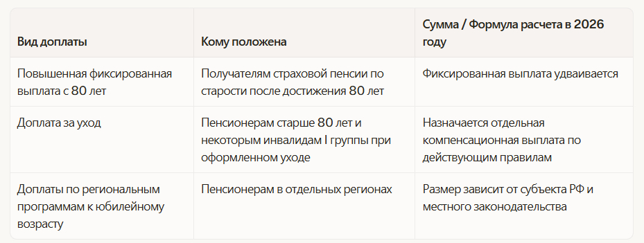 СФР автоматически увеличивает выплаты после юбилея. Выплата для пенсионера после 80 лет вырастает ровно на 100% от базовой фиксированной части. Государство добавляет еще 9 584,69 руб., в результате общая сумма ФВ достигает 19 169,38 руб. Эта надбавка к пенсионному обеспечению назначается без заявлений в месяц 80-летия, предоставляя существенную поддержку для пенсионера.