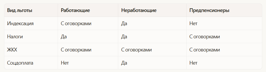 Доступная помощь зависит от трудового статуса, охватывая такие группы как пенсионеры и предпенсионеры. В этом периоде мера социальной поддержки выровнялась: работающим гражданам вернули плановые индексации, что затронуло интересы пенсионеров и предпенсионеров.
