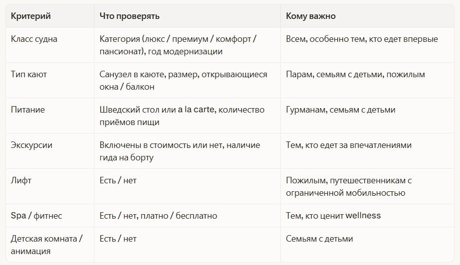 Подборка актуальна для навигации 2026 года. Состав услуг зависит от конкретного оператора и рейса — уточняйте у перевозчика перед бронированием.