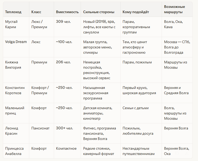 Подборка сформирована на основе открытых маршрутных страниц операторов («Водоход», «Созвездие», Volga Dream, «Донинтурфлот»), описаний бортовой инфраструктуры и рейтинговых публикаций сезона 2025–2026.