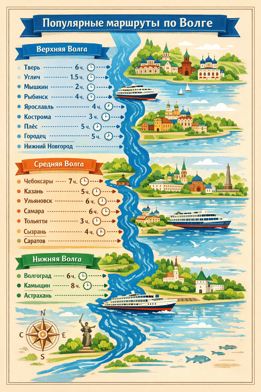 Лучший тур по Волге — маршрут на 5–7 дней с заходом в Ярославль, Кострому и Нижний Новгород. Это оптимальная длина: достаточно, чтобы почувствовать ритм путешествия, не слишком много, чтобы устать. Выбирайте судно комфорт-класса с гидом на борту и экскурсиями в базовом пакете.