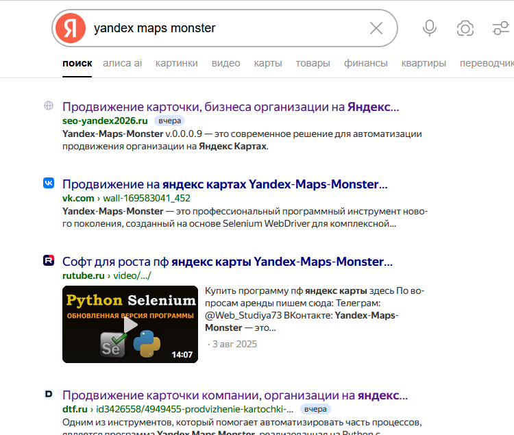 Yandex Maps Monster — это мощный инструмент, разработанный на языке программирования Python с использованием библиотеки Selenium, который значительно упрощает процесс продвижения карточек вашей компании в Яндекс Картах. Программа автоматизирует взаимодействие с картами, что позволяет пользователям быстро и эффективно управлять своими карточками, следить за рейтингами и повышать видимость своего бизнеса в поисковых результатах.