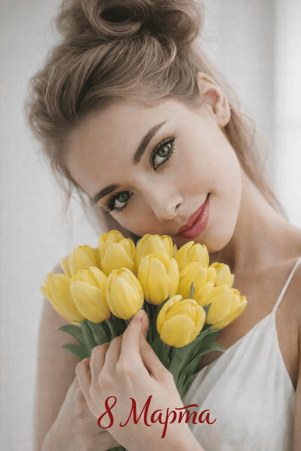 Используй внешность женщины с загруженного референсного фото. Она держит двумя руками объемный букет свежих желтых тюльпанов на уровне груди, слегка наклонив лицо к бутонам и томно смотрит в камеру. Она одета в легкий сарафан. Действие происходит в светлой минималистичной студии с гладкими белыми стенами в середине дня при ясной погоде. Фотография выполнена в стиле современного студийного минимализма с нейтральной цветовой палитрой и акцентом на растительной фактуре. Вертикальная ориентация кадра, мягкий рассеянный свет из большого окна слева, макросъемка с фокусом на текстуре лепестков и лице модели, размытый задний фон. 8k resolution, photorealistic, vertical, soft natural window light, 85mm lens, f/1.4, shallow depth of field, sharp focus on face and flowers, high detail, muted tones.