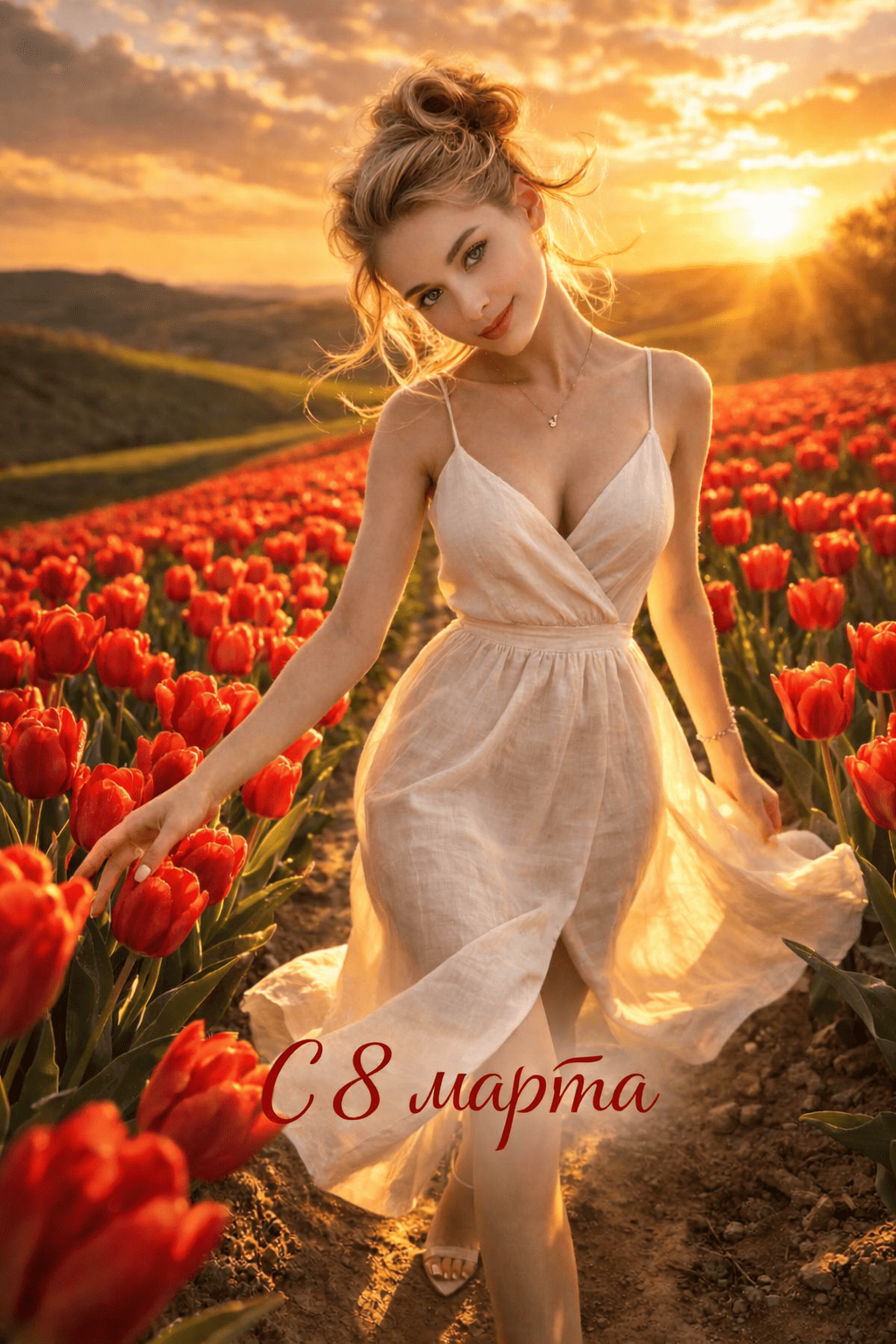 Используй внешность женщины с загруженного референсного фото. Она идет навстречу камере по узкой земляной тропинке сквозь густое поле красных тюльпанов, касаясь бутонов опущенной правой рукой. Локация представляет собой открытую холмистую местность на закате во время золотого часа, ветер развевает подол ее льняного платья. Стиль объединяет пейзажную и фэшн-фотографию с теплой, обволакивающей цветокоррекцией. Вертикальная ориентация, теплый контровой свет низкого солнца, широкоугольный объектив для захвата перспективы поля, четкий фокус на лице модели и растениях на переднем плане. cinematic lighting, vertical, golden hour sunlight, backlight, 35mm lens, f/2.8, hyper-detailed nature, vibrant colors, 8k resolution, photorealistic.