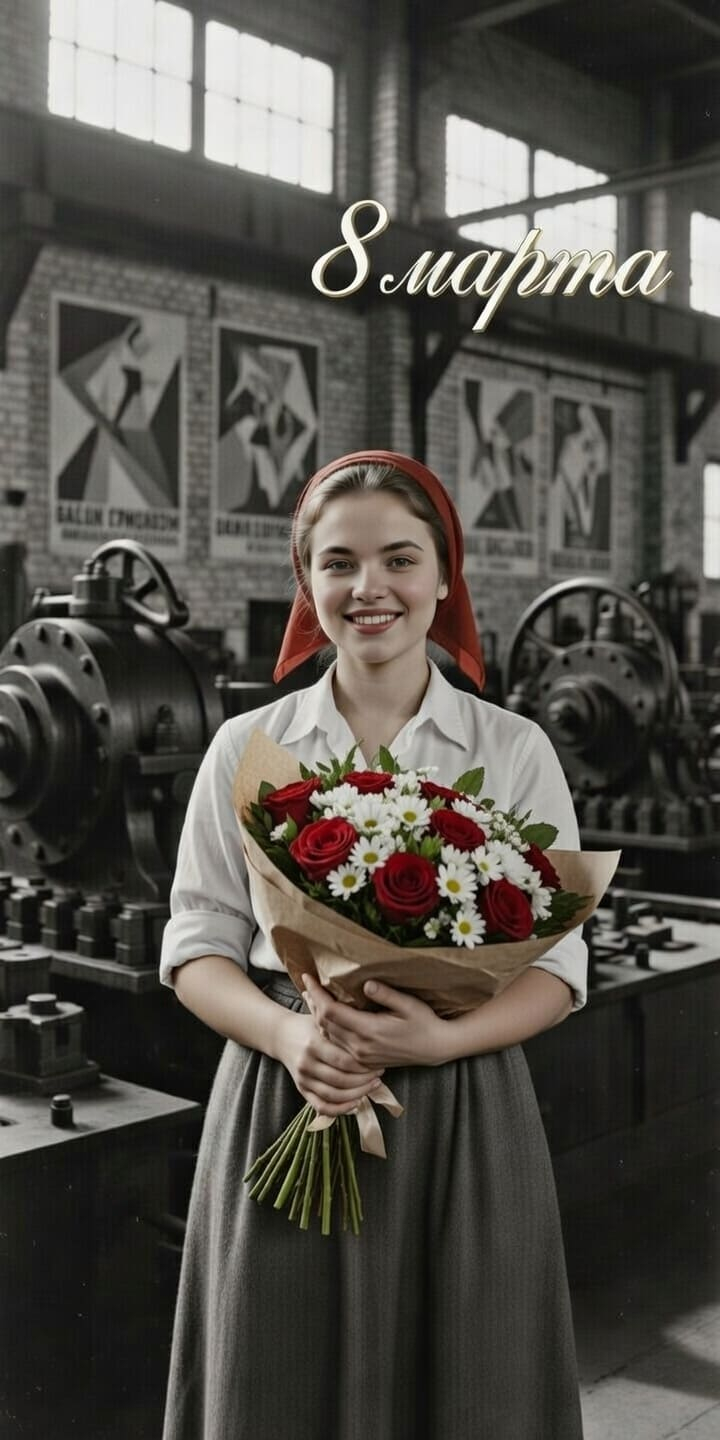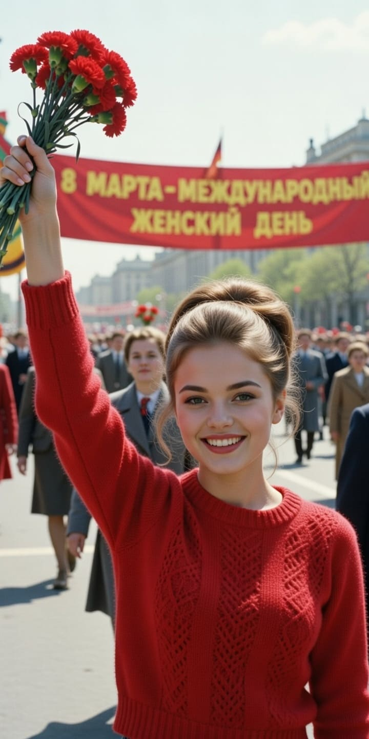 Используй внешность женщины с загруженного референсного фото. Она идет в первых рядах праздничной колонны, широко улыбаясь и подняв высоко над головой правую руку с букетом красных гвоздик. Окружение представляет собой просторную, залитую весенним солнцем советскую площадь 1970-х годов, позади нее виднеются размытые фигуры идущих людей и масштабный кумачовый плакат с желтой надписью "8 МАРТА - МЕЖДУНАРОДНЫЙ ЖЕНСКИЙ ДЕНЬ". Фотография выдержана в стиле парадной советской фотохроники на цветную пленку с доминирующими теплыми, насыщенными красными оттенками. Вертикальная ориентация, жесткий естественный полуденный свет, создающий яркие блики в волосах, объектив со средним фокусным расстоянием для охвата масштаба шествия, фокус на счастливом лице героини, заметное пленочное зерно. vintage film photography, vertical, 1970s soviet parade aesthetic, Svema film simulation, bright spring sunlight, hard daylight, prominent red and yellow tones, text "8 МАРТА - МЕЖДУНАРОДНЫЙ ЖЕНСКИЙ ДЕНЬ", 50mm lens, f/4.0, medium depth of field, sharp focus on face, heavy film grain, historical reportage, joyful atmosphere, highly detailed.