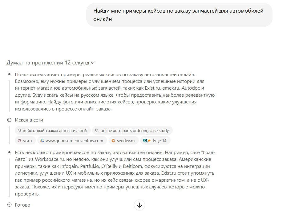 Промт 1: «Найди мне примеры кейсов по заказу автозапчастей онлайн»