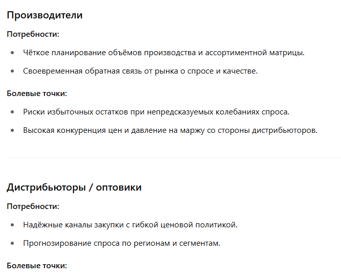 Промт: «Назови основные роли на рынке автозапчастей. Затем с позиции каждой роли скажи: какие у неё главные потребности и болевые точки?»