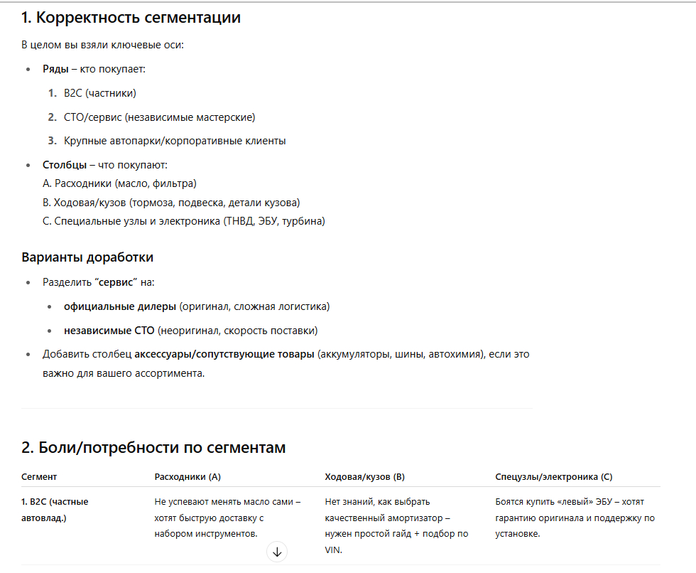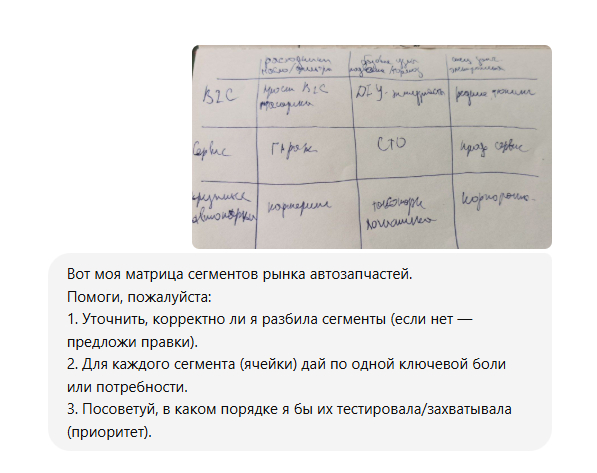 Что получилось: GPT посмотрел на мою схему и дал конкретные рекомендации по каждой ячейке. Сказал, что лучше всего заходить в сегмент «СТО + стандартные узлы» — там хорошая маржа и средняя конкуренция.