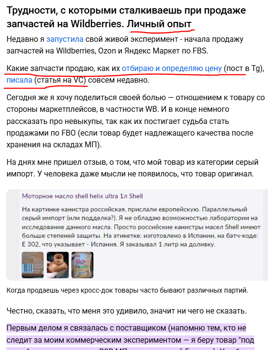 Захожу, нахожу личный опыт, ещё несколько кейсов продажи автозапчастей на маркетплейсах. Плюс читаю комментарии — там люди рассказывают своё мнение, живое. Такой поиск фактуры очень удобный.