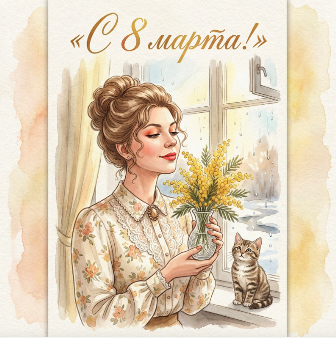 Используй лицо девушки с загруженного фото. Сохранить внешность девушки с референса без изменений — лицо полностью узнаваемое, фотореалистичное. Создать нежную весеннюю открытку в стиле советских акварельных иллюстраций 1950-х годов. Вертикальный формат 9:16, качество 8K RAW, текстура торшонированной бумаги, легкие акварельные разводы по краям. В верхней части открытки надпись изящным каллиграфическим шрифтом с завитками, охра с золотым отливом: «С 8 марта!». Образ: Девушка с русыми волнистыми волосами, собранными в высокую прическу с локонами у висков. На ней нарядная блуза цвета слоновой кости с мелким цветочным рисунком и брошью у ворота. Макияж: естественный, персиковые тени, губы цвета спелой земляники (#C94A4A). Поза: Девушка стоит у приоткрытого окна, держа в руках маленькую хрустальную вазочку с веточкой пушистой мимозы. Она вдыхает аромат весны, глаза полуприкрыты, на губах мечтательная улыбка. Фон: Комната, на подоконнике сидит полосатый котенок, за окном — тает снег, видна капель. Освещение: Мягкий утренний свет из окна. Детали: проработаны капли воды на стекле, текстура мимозы, кружево на блузе. Цветовая гамма: охра, золото, бледно-желтый, слоновая кость.