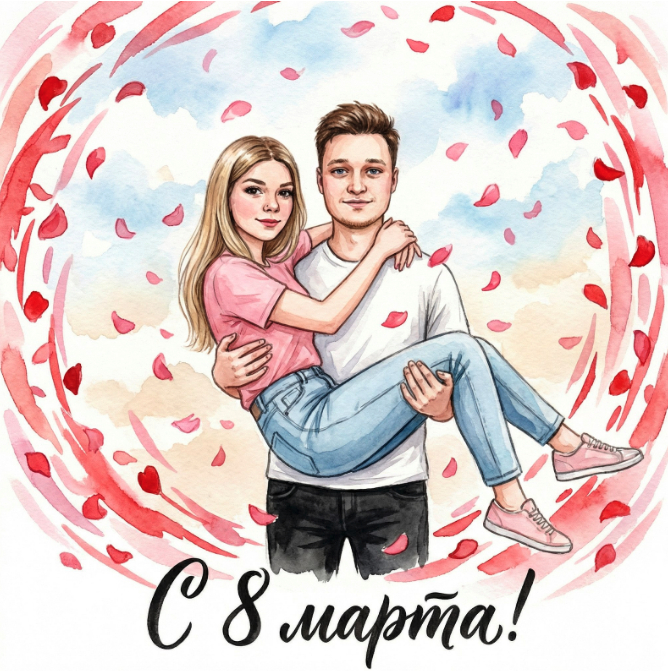 В центре композиции — персонажи с исходного изображения с точным сохранением черт лица (идентичность один в один): девушка в нежно розовой футболке и светло-голубых джинсах. мужчина в белой футболке и черных джинсах; Мужчина держит девушку на руках, а вокруг них падают лепестки розовых роз. Вокруг семьи — лёгкие акварельные разводы и лепестки красного цвета, создающие праздничную атмосферу. 5. Фон — светлый, с мягкими акварельными переходами (белый, голубой, бежевый), напоминающий небо с лёгкими облаками. 6. В нижней части баннера чёрным красивым рукописным шрифтом (гуашью) выведи надпись: «С 8 марта!. Шрифт должен быть легко читаемым, с небольшим декоративным акцентом. 7. Общая стилистика — тёплая, семейная, романтичная, с акцентом на единство и любовь. Цветовая гамма — мягкая, с доминированием розовых, белых и голубых оттенков.