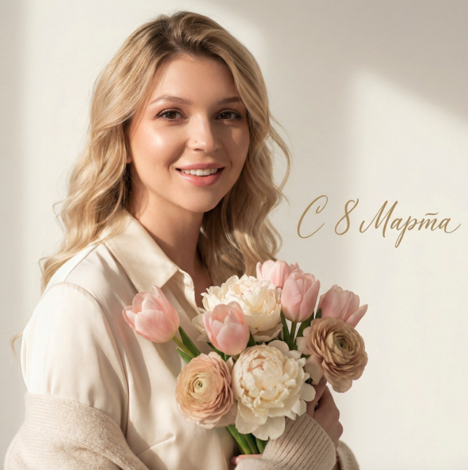 Transform the original photo into a stylish International Women’s Day greeting card (March 8). Keep the person’s facial features максимально узнаваемыми и естественными. Create an elegant, aesthetic Pinterest-style композицию. Soft natural lighting, premium editorial look, clean minimal background. Add delicate spring flowers (tulips, peonies or ranunculus) in soft pastel tones — blush pink, ivory, muted beige. The character: confident, feminine, graceful posture, natural relaxed smile, subtle makeup, glowing skin, neat hairstyle (soft waves or low bun). Outfit: elegant light-toned outfit (cream blazer, silk blouse, or soft knit sweater), no bright prints, no flashy colors. Atmosphere: airy, warm, refined, modern европейская эстетика. Add subtle handwritten typography “С 8 Марта” in minimal calligraphy style. Depth of field, soft shadows, high detail, professional photography, 85mm lens, cinematic light. No cheap effects, no glitter, no stickers, no bold gradients, no WhatsApp-style greeting card elements.