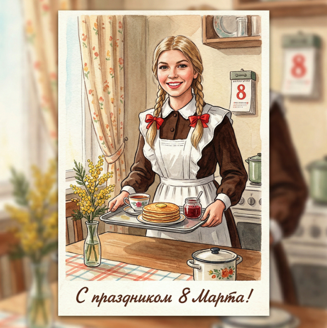 Используй лицо девушки с загруженного фото. Сохранить внешность. Стиль: советская открытка 1960-х годов, рисованная акварель, но с фотореалистичным лицом. 9:16, 8K, текстура бумаги с легким глянцем. В нижней части открытки надпись простым шрифтом от руки: «С праздником 8 Марта!». Образ: Девушка (выглядит как старшеклассница или студентка) в школьной форме или скромном платье с белым фартуком. Волосы заплетены в косички, вплетены ленты. Макияж: минимальный, естественный. Поза: Она стоит у кухонного стола и держит в руках поднос с завтраком — румяные блины, чашка, вазочка с вареньем. Рядом на столе стоит баночка с веточкой мимозы. Она улыбается застенчиво и радостно. Фон: Уютная советская кухня, на стене висит календарь с цифрой 8, занавески на окне. Детали: текстура скатерти, эмалированная кастрюля. Негатив: Ошибки в надписи. Лишние руки