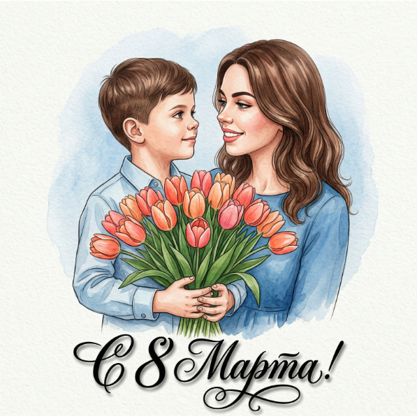 Создайте иллюстрацию: портрет ребёнка и мамы (до груди) в центре кадра, волосы ухоженые, видны уши; он одет в нежно-голубую рубашку. Ребёнок держит перед грудью крупный плотный букет тюльпанов оранжево‑розовой и нежно-оранжевой гаммы с живыми зелёными листьями, маленькие руки крепко охватывают стебли. Мальчик расположен полубогом к кадру, мама стоит перед ним так же полубогом к кадру, смотрит на ребёнка и мило улыбается, у мамы платье синего цвета и распущены волнистые волосы, мальчик смотрит на маму. Фон — мягкий белый холст с едва ощутимым акварельным голубым ореолом вокруг фигуры. Внизу крупная чёрная каллиграфическая подпись «С 8 Марта!» с изящными завитками и лёгкой тенью. Стиль — детальная акварельная иллюстрация: тонкая линия, реалистичная фактура бумаги, мягкие тени, тёплая праздничная атмосфера, высокая детализация цветков и прядей, симметричная и спокойная композиция, мягкое рассеянное освещение.