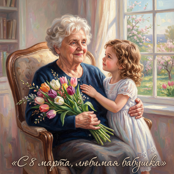 Создай портрет, не меняя черты лица. Нежная масляная картина, пожилая женщина с мягкой улыбкой сидит в кресле, держит букет тюльпанов, маленькая внучка обнимает её, девочка в белом легком платье. теплый солнечный свет, пастельный фон,окно с весенним пейзажем, реалистичная живопись, внизу надпись «С 8 марта, любимая бабушка», ultra detailed, oil texture, 4k