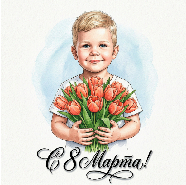 Вертикальная портретная иллюстрация 9:16, центрированный кадр, верхняя часть туловища ребёнка спереди. Мальчик одет в белую футболку. Ребенок держит крупный плотный букет тюльпанов оранжево-розового цвета, плотные лепестки, свежие зелёные листья, букет расположен прямо перед грудью, кисти рук маленькие обхватывают стебли. На фоне мягкий белый фон с лёгким акварельным голубым ореолом вокруг ребенка. Внизу композиции крупная черного цвета каллиграфическая подпись С 8 Марта! с изящными завитками и тенью. Стиль — детальная акварельная/ иллюстративная живопись, мягкие тени, тонкая линия, реалистичная текстура бумаги, тёплая праздничная атмосфера, высокая детализация цветов и волос, симметричная композиция, мягкое рассеянное освещение.