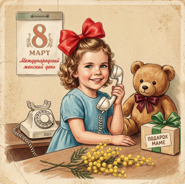 Винтажная иллюстрация в стиле советской открытки 1950-х годов: девочка 3 лет в простом светло-голубом платье с крупным ярко-красным бантом в волосах, сидящая за столом. Она держит в руке белую трубку старинного телефонного аппарата; рядом на столе — дисковый телефон. Справа от девочки стоит плюшевый мишка с бантом у шеи и подарочная коробка с зелёной лентой, на коробке четко читается надпись на русском: «ПОДАРОК МАМЕ». На стене позади — лист календаря с крупной цифрой «8 МАРТ» и надписью курсивом «Международный женский день». На переднем плане — веточки мимозы с желтыми пушистыми соцветиями. Композиция — портретная, кадр по пояс, персонажи и предметы центрированы, фотографический ракурс слегка сверху. Стиль исполнения: ручная живопись (акварель с элементами гуаши и пастели), мягкие кистевые штрихи, тонкая зернистая фактура бумаги, приглушенная тепловая палитра (кремовые, бежевые и охристые тона фона), акцентные цвета — голубой платья, красный бант, желтая мимоза. Лёгкая виньетка по краям, имитация старой бумаги с потёртостями, трещинками и пожелтением, чуть приглушенные контуры, мягкие тени, ровное рассеянное освещение, атмосфера ностальгии и сентиментальности. Детали и типографика: каллиграфическая рукописная надпись «Международный женский день» курсивом красным цветом; цифра «8» крупная, в декоративном ретро-шрифте. Надпись на коробке — строгими заглавными буквами. Добавить слегка потертые края и узоры старой печати.